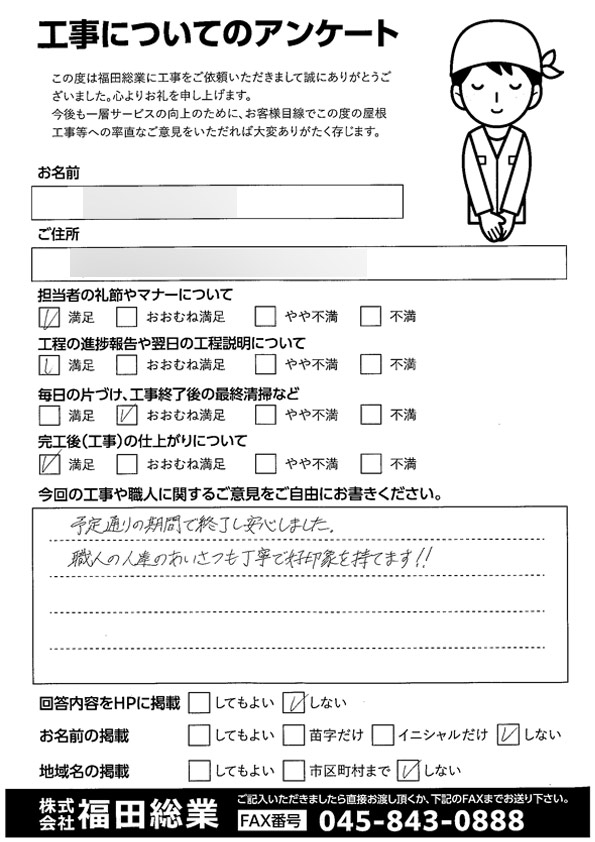 弊社ではお客様になるべくご迷惑をおかけしないように、工期通りに終了するように努めております。